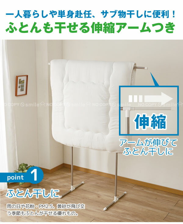 上部の伸縮アームを伸ばせばふとんも干せます! 雨の日や梅雨、花粉、PM2.5の多い時期も安心!外出がちで部屋干しの多い方に最適! 使用後は折りたたんでコンパクトに収納できます。